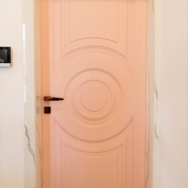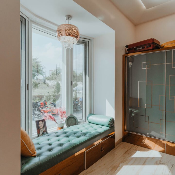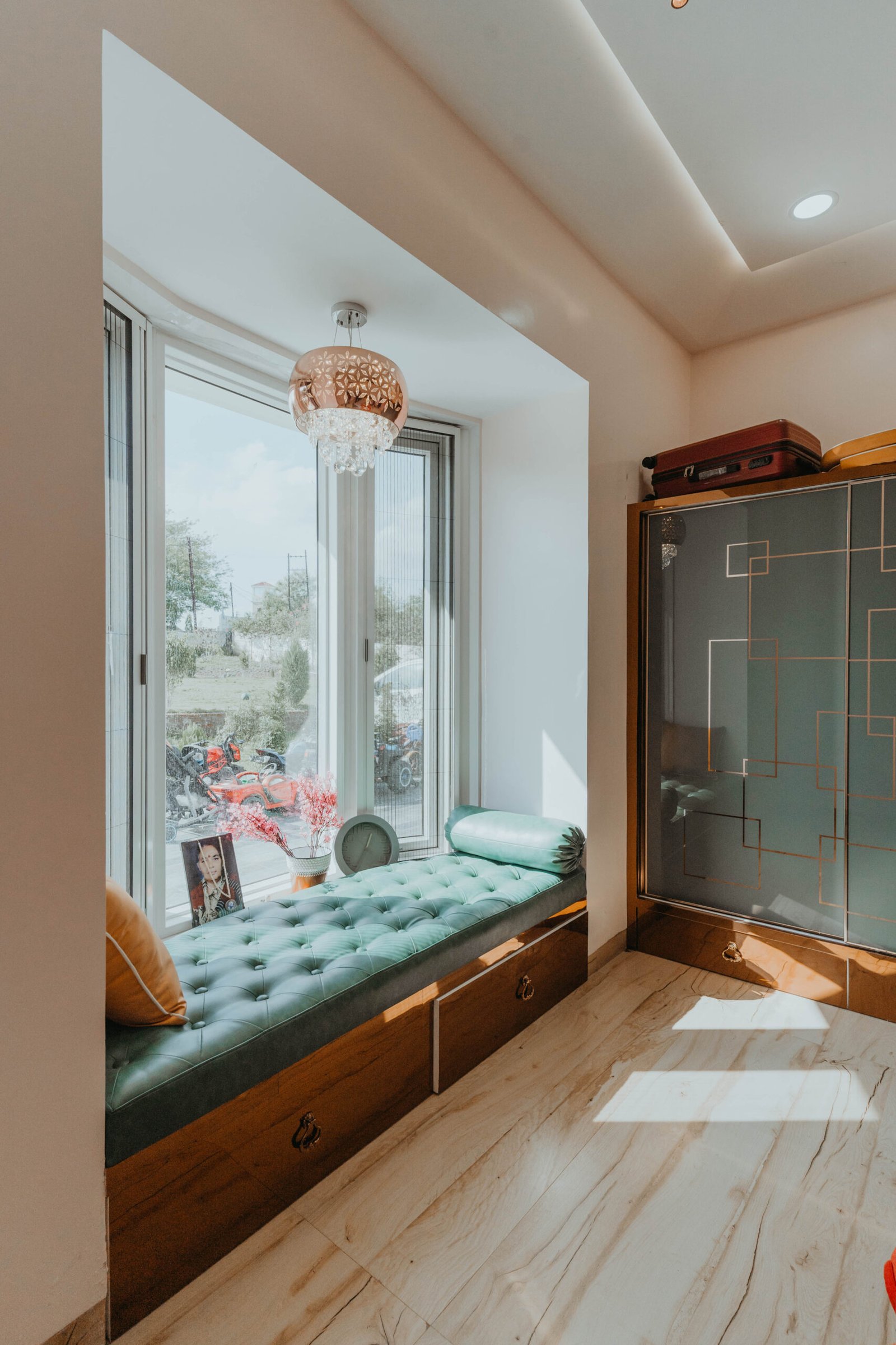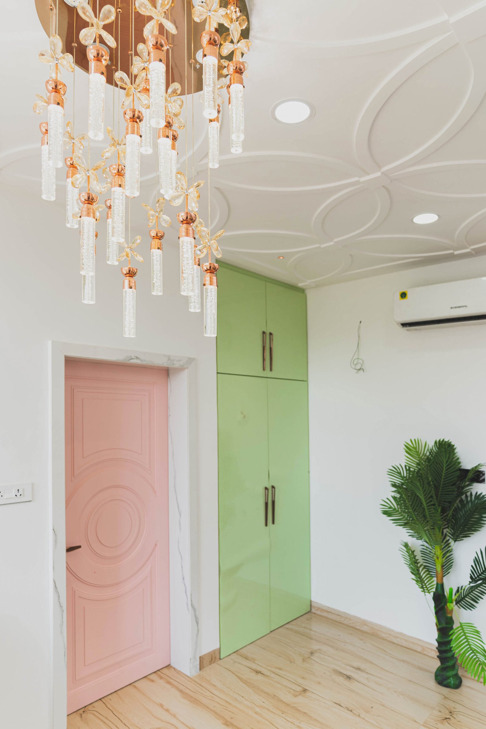 A contemporary interior done for an nri couple depicting minimalism with pastel hues.
