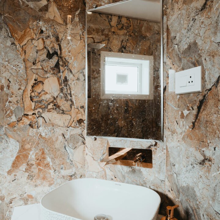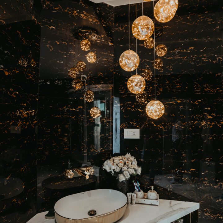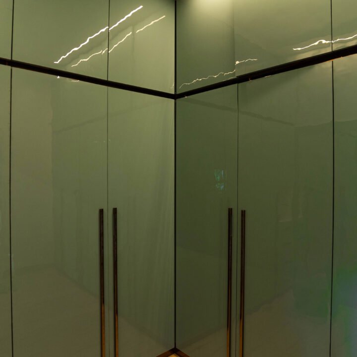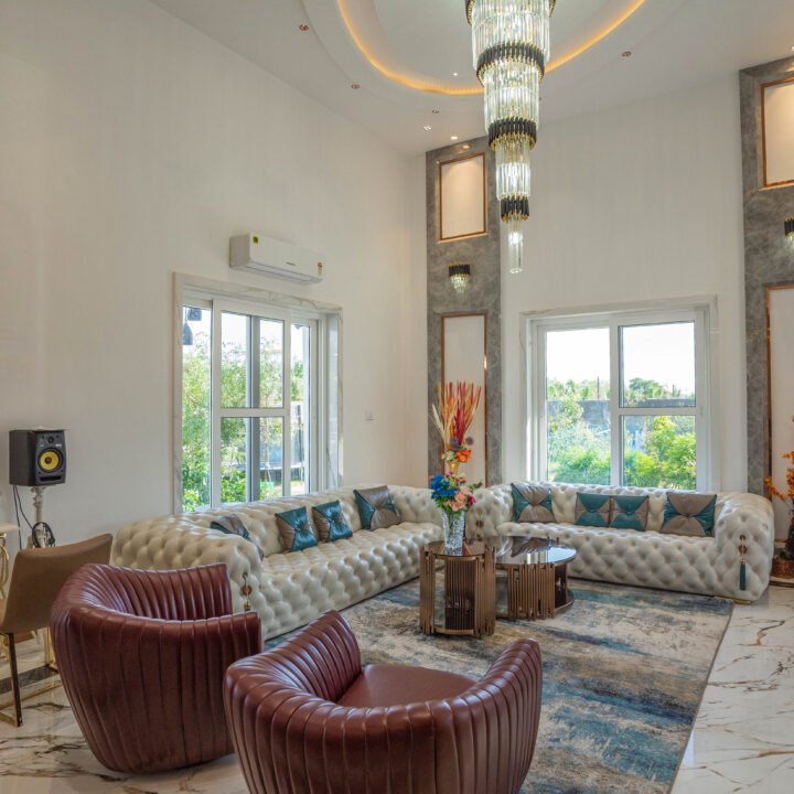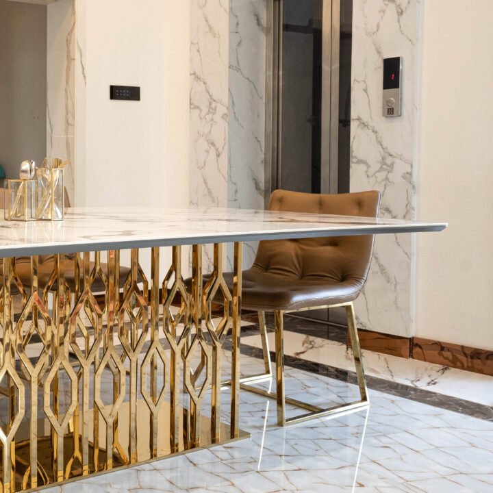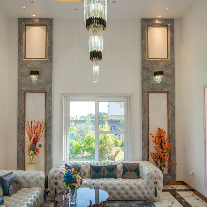 A contemporary interior done for an nri couple depicting minimalism with pastel hues.