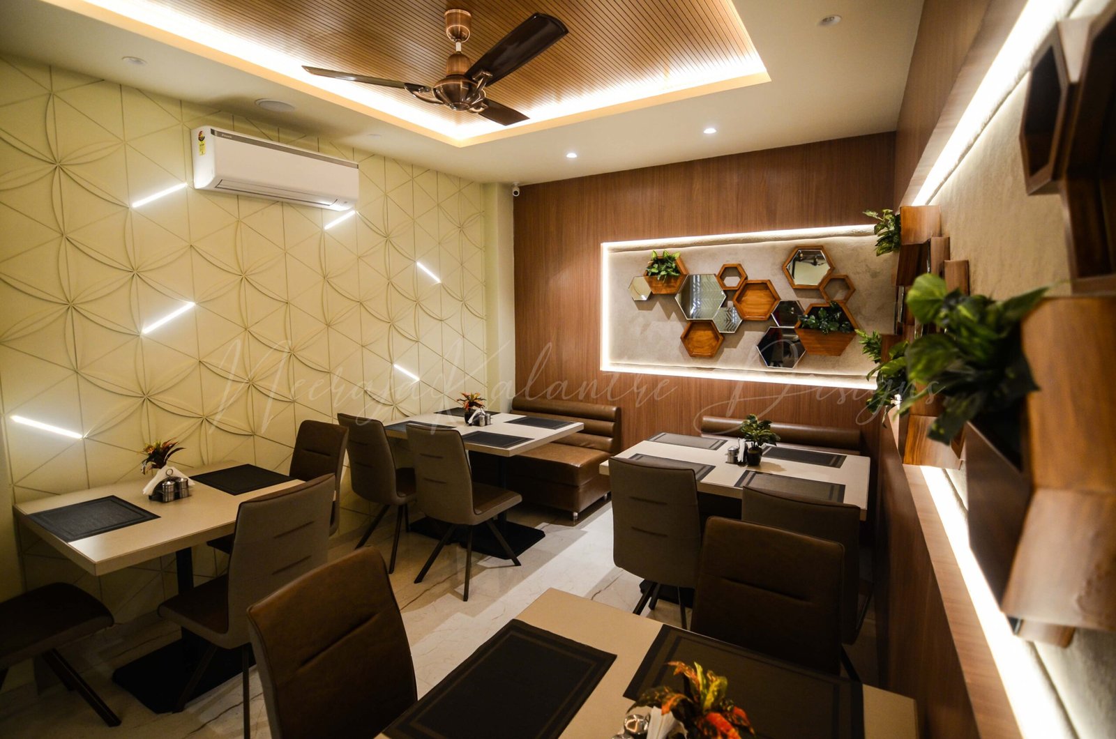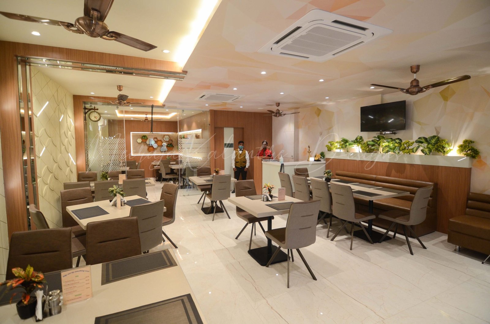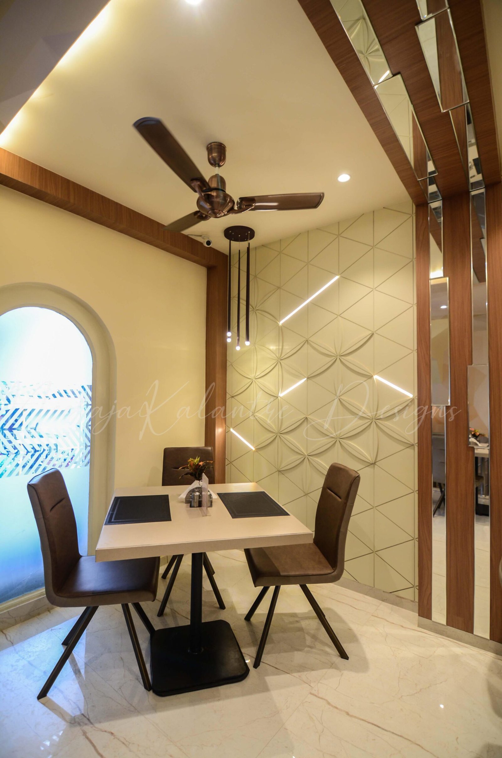 This popular retro in Sadar Bazaar Jabalpur, needed a do-up and the client insisted on designing it in a very unique simplistic, and modernist way. The decor of the retro then resulted in a light theme clubbed with a darker upholstery of the furniture and the wall paneling acted as the focal element projecting modernist art through clean lines and abstract lighting.